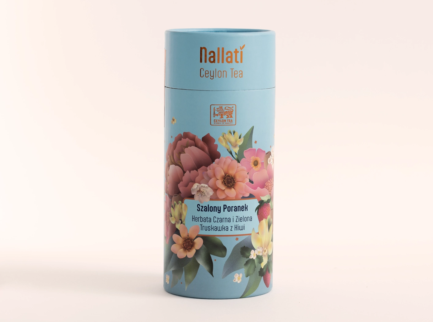 Składniki: Mieszanka oryginalnej czarnej i zielonej herbaty cejlonskiej, liściastej o smaku truskawki i kiwi: czarna herbata cejlońska 70%, zielona herbata cejlońska 20%, aromat truskawkowy 3%, kawałki papai 3%, skórka z cytryny, płatki róży, trawa cytrynowa, aromat kiwi, , kwiat niebieskiej kukurydzy, kwiat nagietka, krokosz.