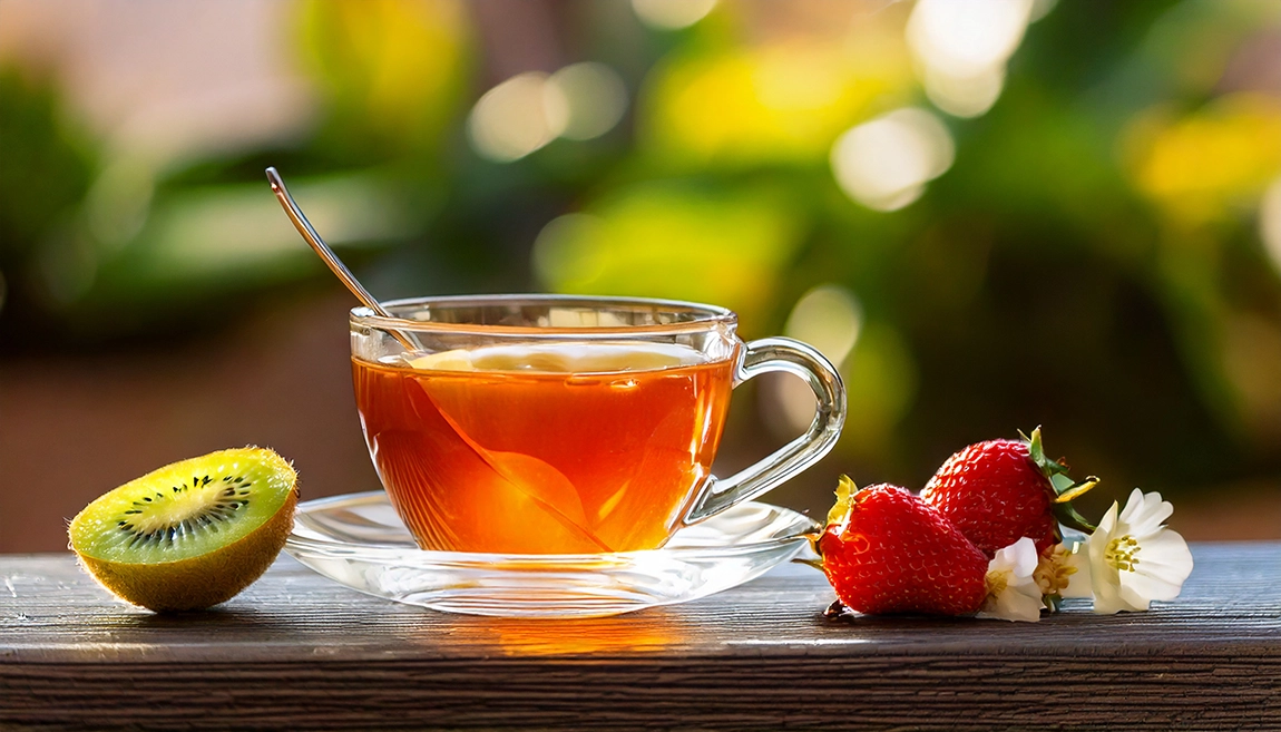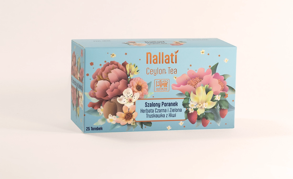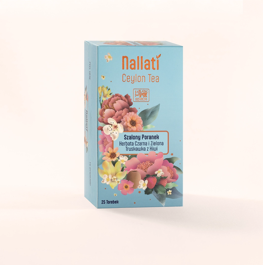 Składniki: Oryginalna cejlońska czarna i zielona herbata z aromatem truskawkowym i kiwi